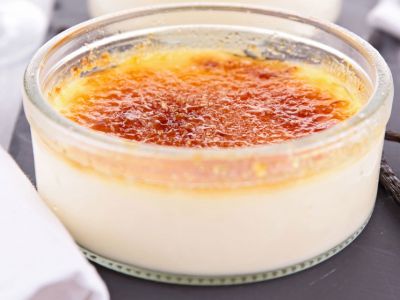 Butter 4 fireproof forms in and fill them with the mass and keep them au bain marie approximately 1 hour in the furnace of 150°C, and afterwards another 15 minutes on 100°C –let them cool down during 2 hours in the refrigerator –powder just before the serving with 1 ell of brown sugar and let it caramelise 5 minutes under the hot spit-roaster of 200°C - if necessary put it back in the refrigerator, in order that the crust is crispy and the crème still running.